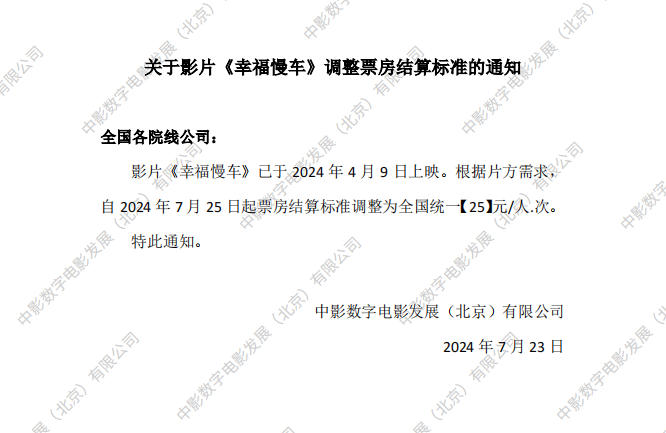 《幸福慢车》调整票房结算标准的通知