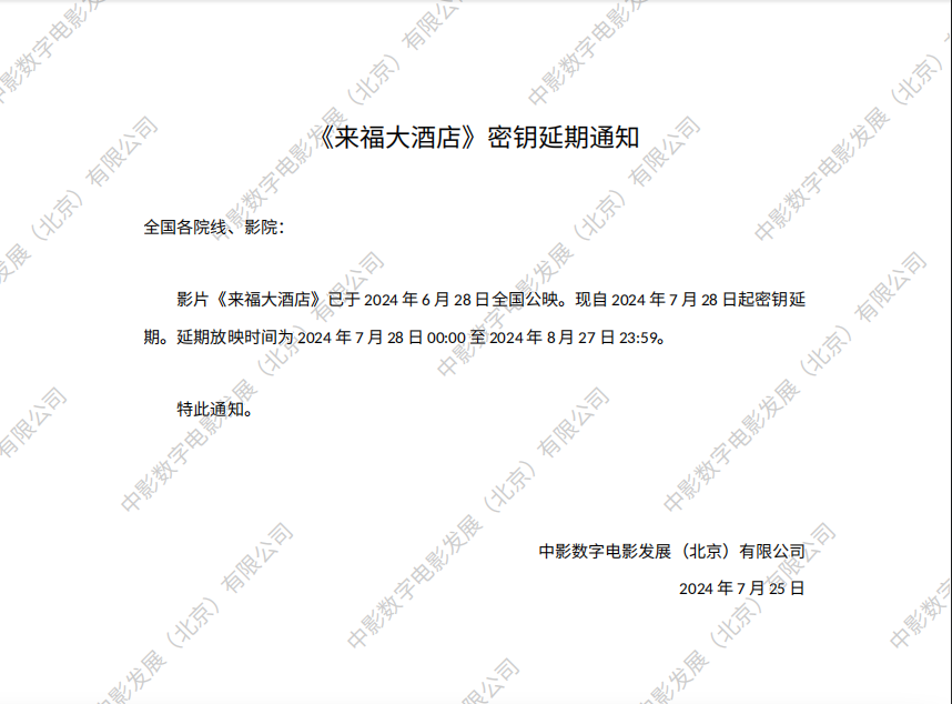 《来福大酒店》密钥延期的通知