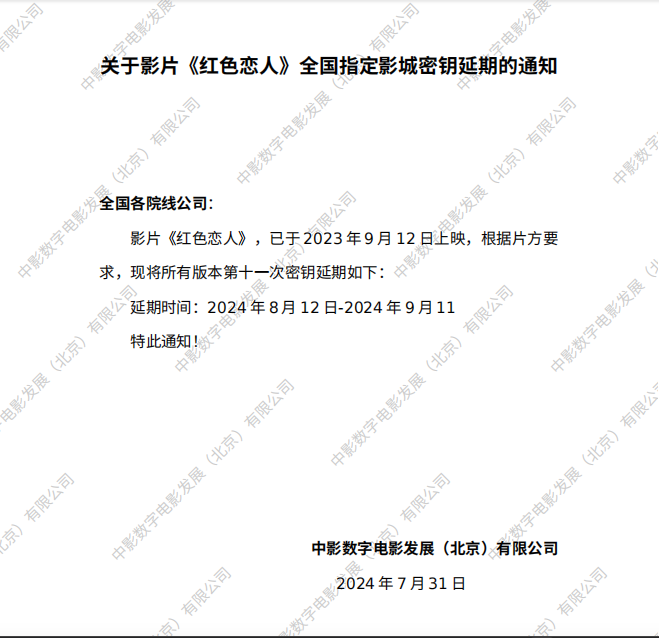 《红色恋人》第十一次全国指定密钥延期的通知