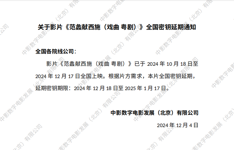 《范蠡献西施(戏曲 粤剧)》密钥延期的通知