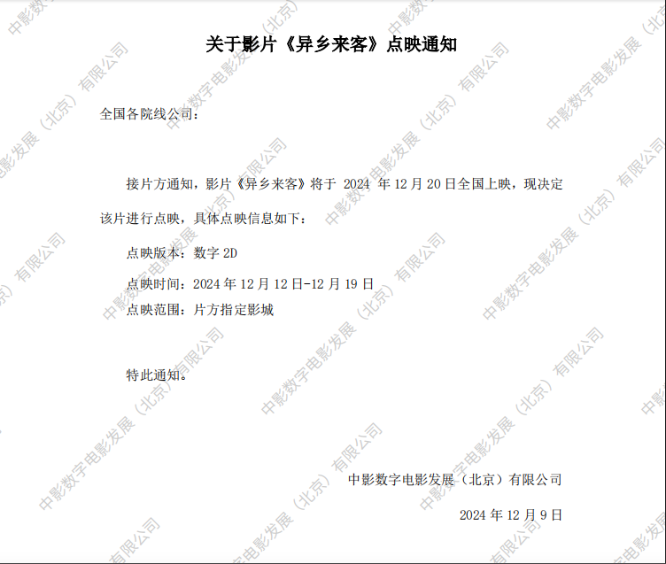 《异乡来客》点映的通知