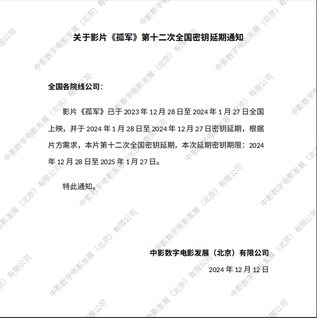 《孤军》第十二次全国密钥延期的通知
