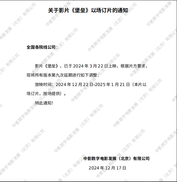 《堡垒》第九次以场订片的通知