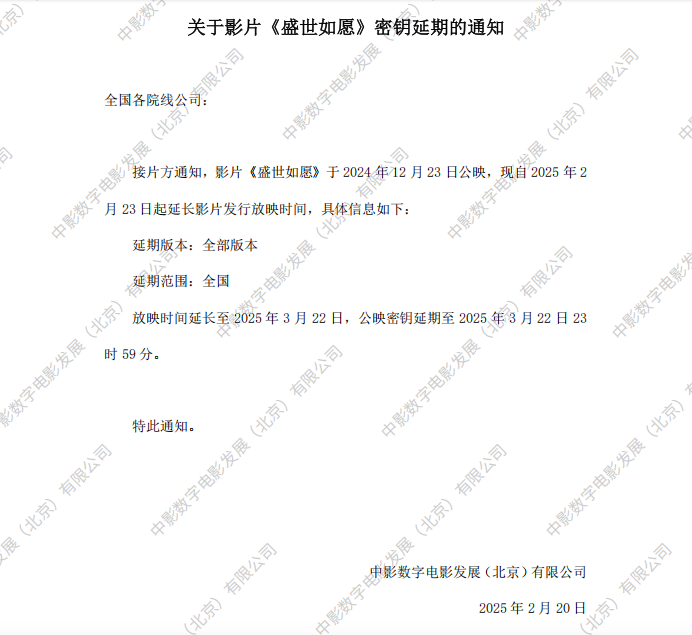 《盛世如愿》第二次密钥延期的通知