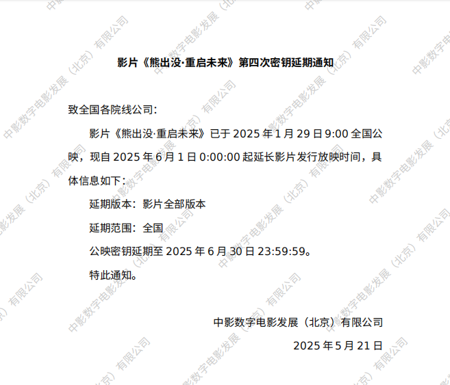 《熊出没·重启未来》第四次密钥延期的通知