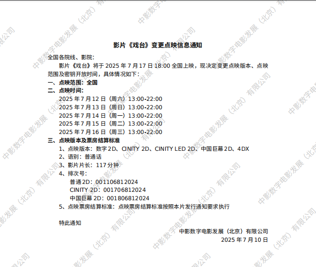 《戏台》变更点映信息的通知
