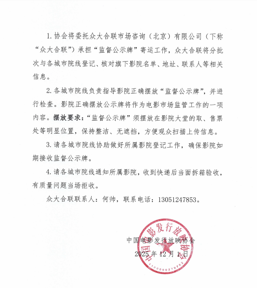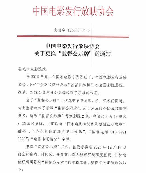 《中国电影发行放映协会关于更换 “ 监督公示牌 ” 通知》