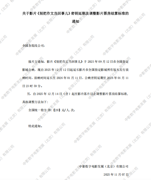 《别把作文当回事》密钥延期及调整影片票房结算标准的通知