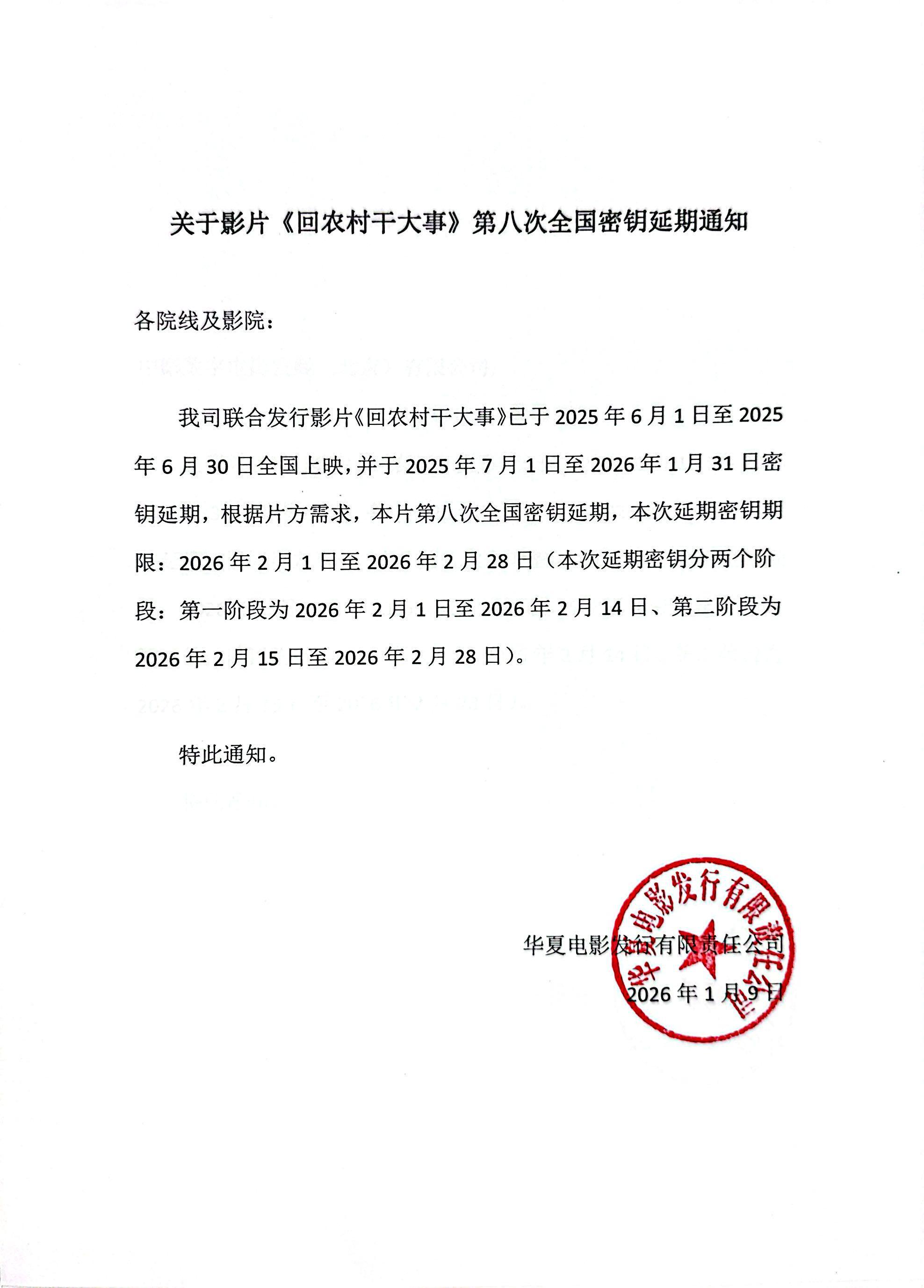 《回农村干大事》第八次全国密钥延期的通知