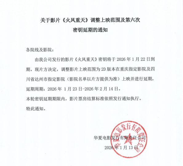 《火凤重天》调整上映范围及第六次密钥延期的通知