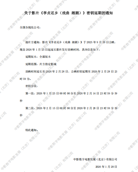 《李贞还乡(戏曲 湘剧)》第四次密钥延期的通知