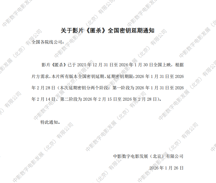 《匿杀》全国密钥延期的通知