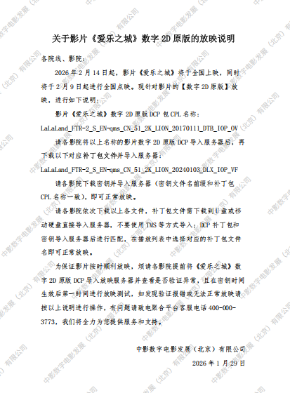 《爱乐之城》数字2D原版的放映说明