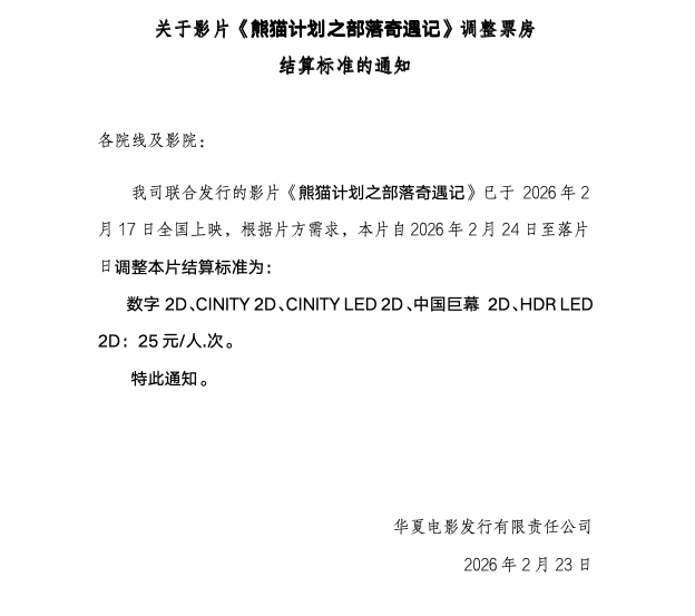 《熊猫计划之部落奇遇记》调整票房结算标准的通知