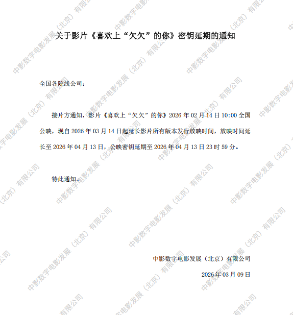 关于影片《喜欢上“欠欠”的你》密钥延期的通知