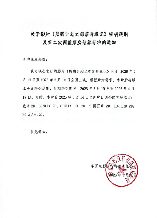 致院线-关于影片《熊猫计划之部落奇遇记》密钥延期及第二次调整票房结算标准的通知