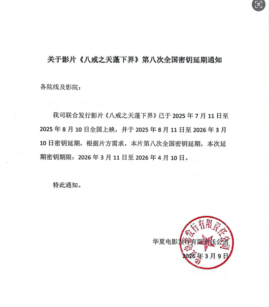 致院线-关于影片《八戒之天蓬下界》第八次全国密钥延期通知