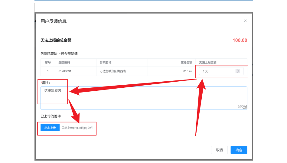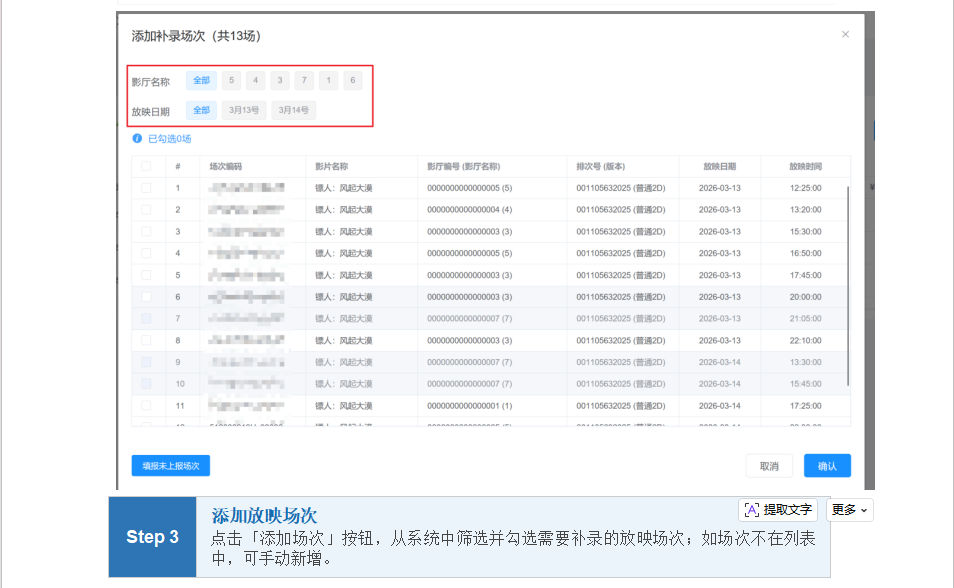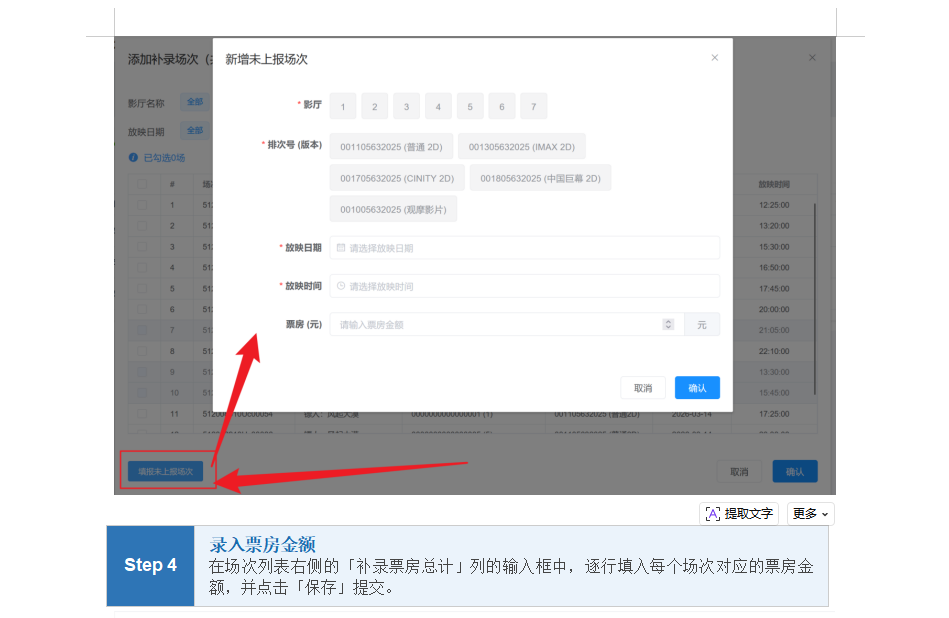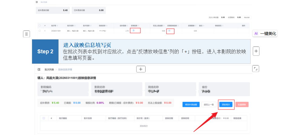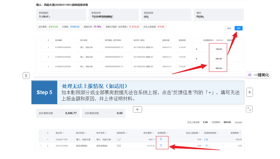 根据实际业务需要,现在聚合平台上线“票房补报”功能。待片方发布单部影片(超标服务费或差异票房)补录任务,涉及的影院可在各自聚合平台上查询到应补明细,影城根据应补明细及实际情况按场进行填报补录,涉及的院线可随时查看补录任务完成的情况。