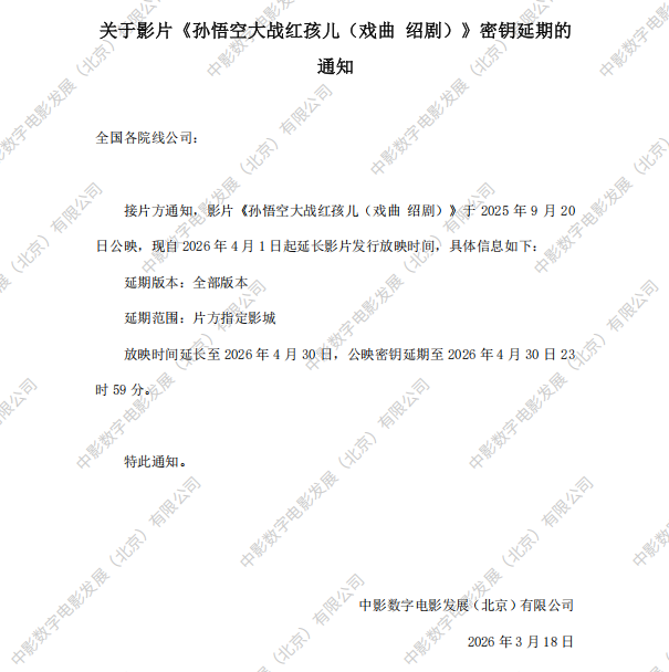 《孙悟空大战红孩儿(戏曲 绍剧)》第六次密钥延期的通知