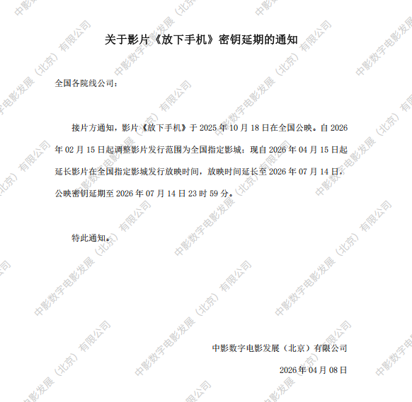 关于影片《放下手机》6次密钥延期的通知