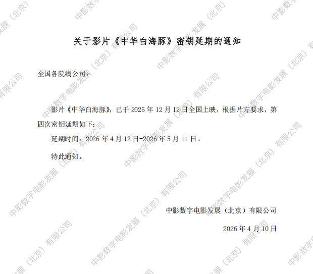 关于影片《中华白海豚》第四次密钥延期的通知