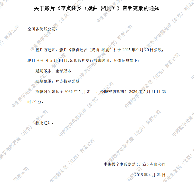 《李贞还乡(戏曲 湘剧)》第七次密钥延期的通知