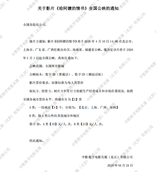 《给阿嬷的情书》全国公映的通知
